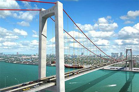 马普托大桥为地锚式悬索桥,主桥跨径680米,桥塔采用门式构造。...