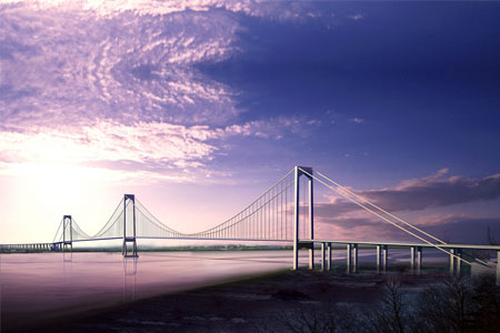 广西龙门大桥为双塔单跨悬索桥,主跨1098m。...