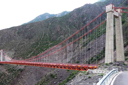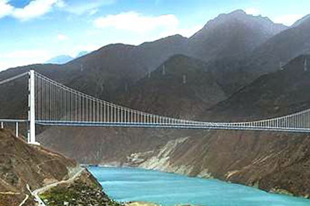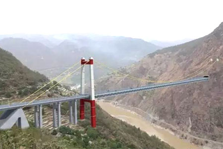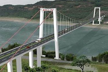 香丽高速公路虎跳峡大桥为独塔单跨地锚式钢桁梁悬索桥,总长1020米。所设计...