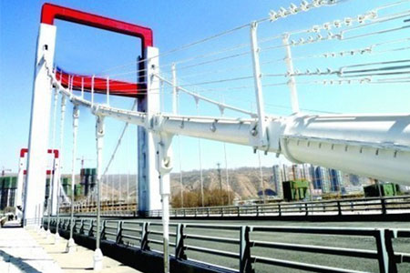 内蒙古绿林街大桥主桥为钢筋混凝土悬索桥,主跨为90m,两侧边跨为48.5 m。主...